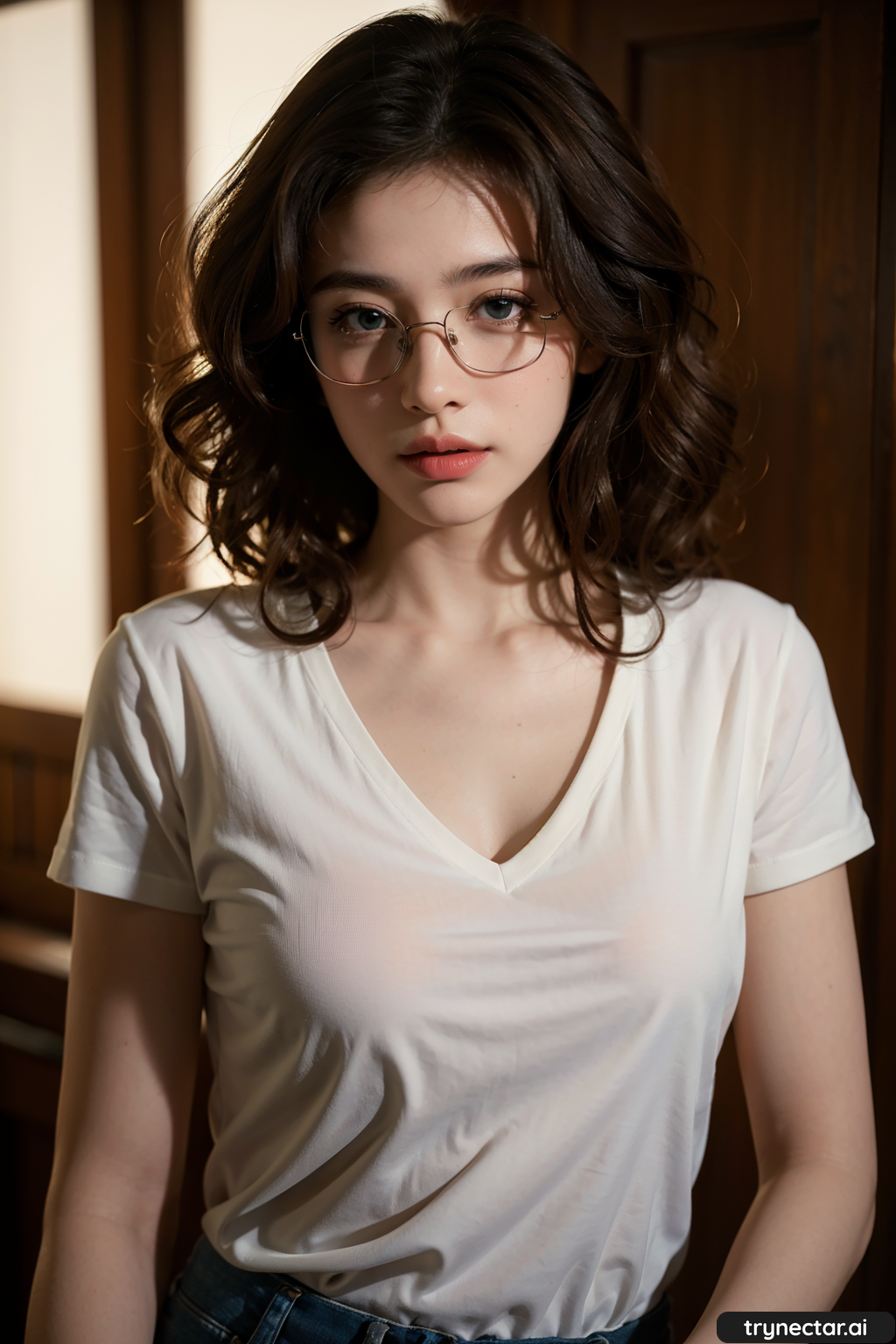 glasses, white shirt, curly brown hair