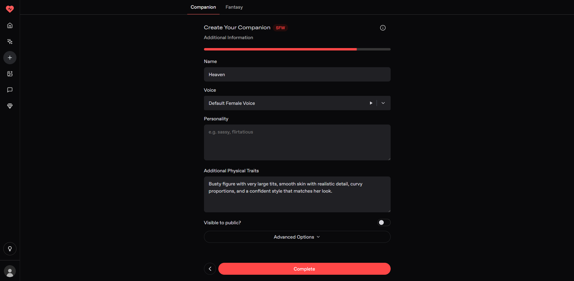 Once the general appearance is set, you can refine the design further with prompts that describe specific physical attributes. This is where users emphasize bust size or other distinct features to customize the AI companion more closely to their vision.