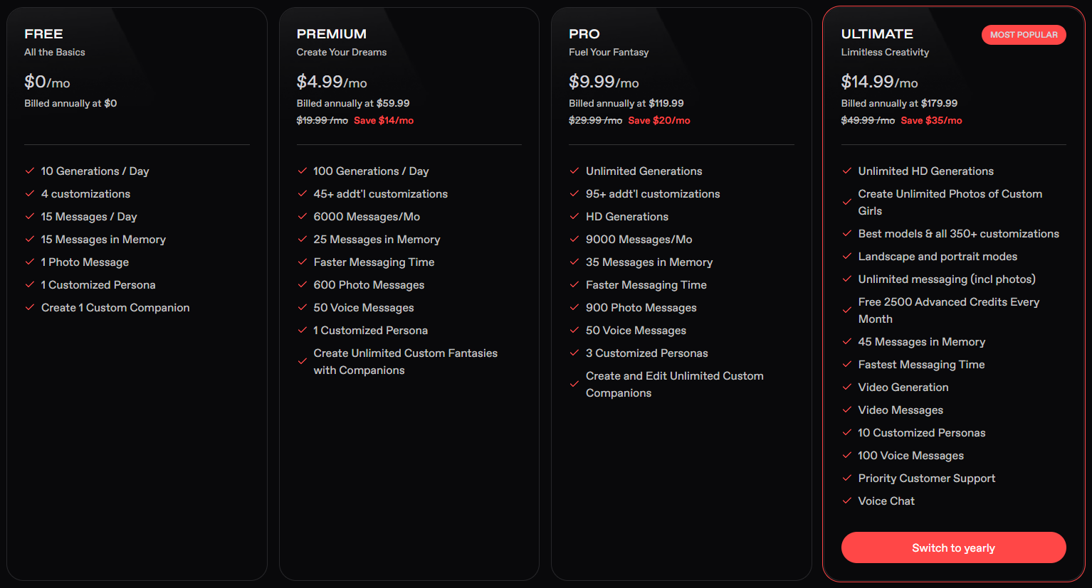 - Ultimate Plan ($14.99 per month or $179.99 annually): Unlocks the highest limits across all categories, plus video generation, advanced messaging options, and priority support. This package is built for users who want complete creative freedom.