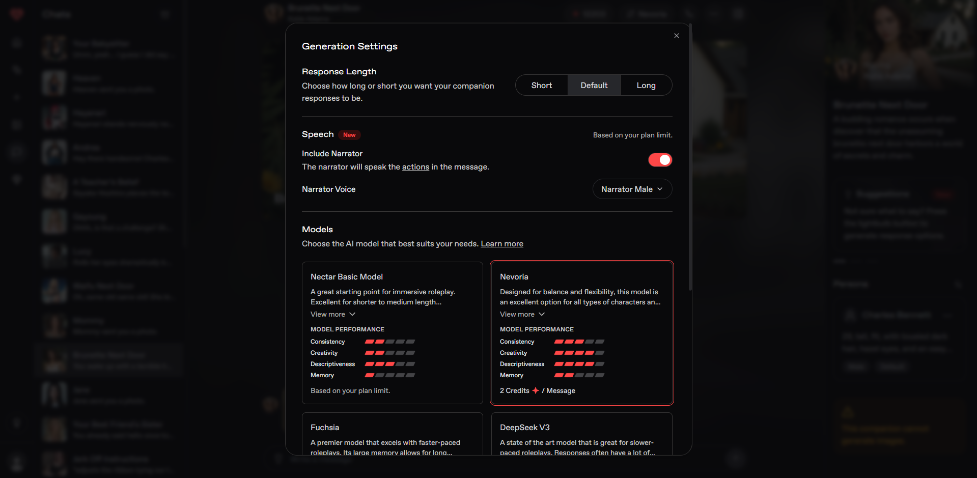 FunFun AI lacks proper voice chat, relying solely on text-based messaging and leaving interactions flat. The absence of audio options makes it harder to create a realistic or engaging bond. Nectar AI includes structured voice features that improve with each subscription tier, seamlessly blending into roleplay for conversations that sound more natural and immersive.