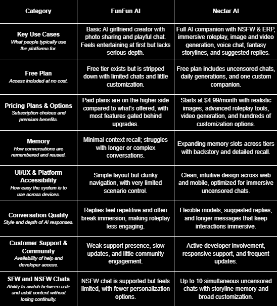 This section provides a direct comparison of FunFun AI and Nectar AI, outlining their strengths and shortcomings so readers can clearly see which platform delivers a better overall experience.