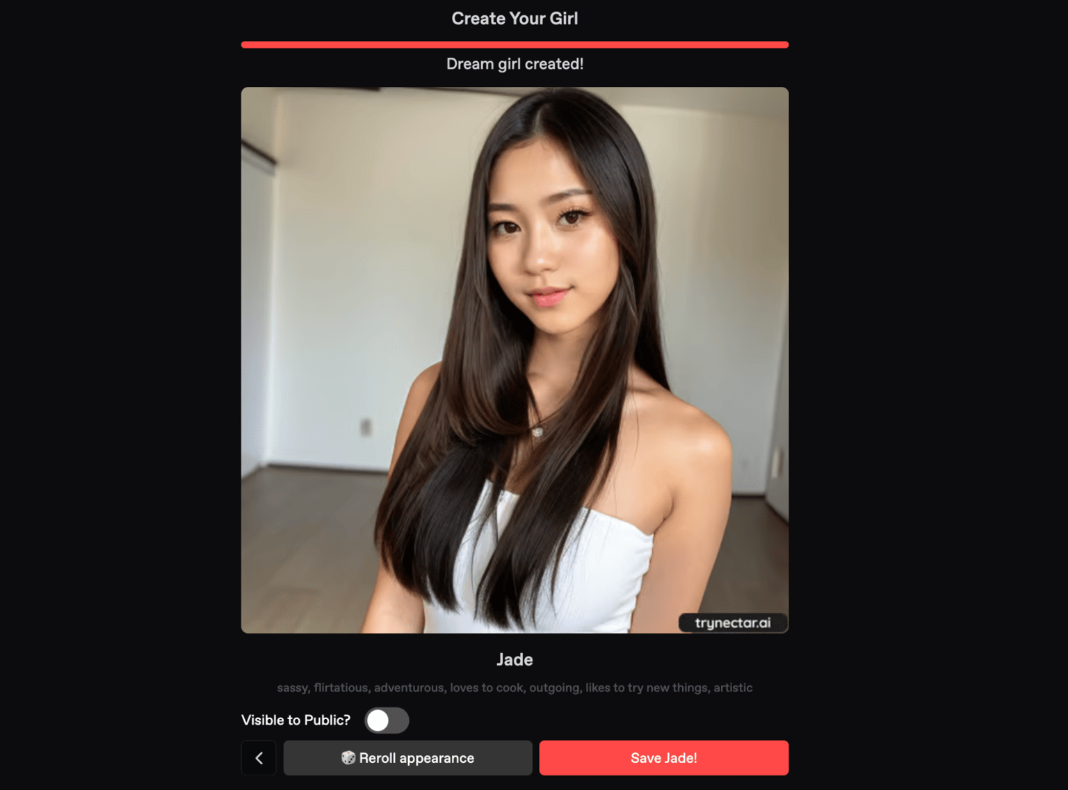 - Generate Personality: Once you're happy with the personality setup, hit the button to generate the fantasy—your AI girlfriend is now ready, with a full personality to match her appearance.