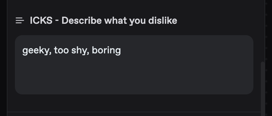 - Set Dislikes: In the "Icks" section, define what things your AI girlfriend dislikes or would rather avoid. These preferences will shape how she responds during conversations.