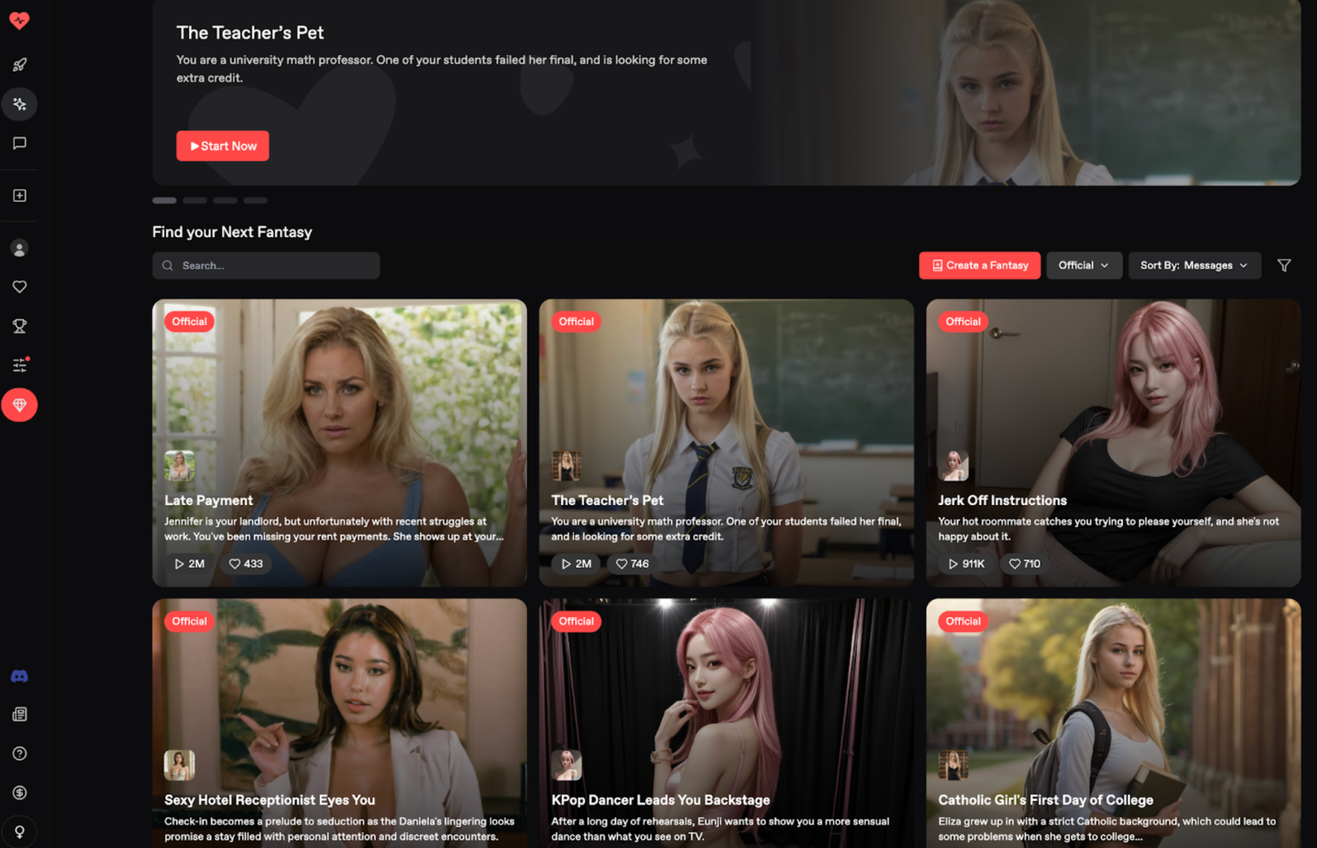 This section is ideal for those who want to jump right into engaging conversations without spending time on customization. The characters on the Fantasy Page are designed by other users, meaning there’s a wide variety of personalities available—from sweet and caring AI partners to dominant and teasing AI mistresses.