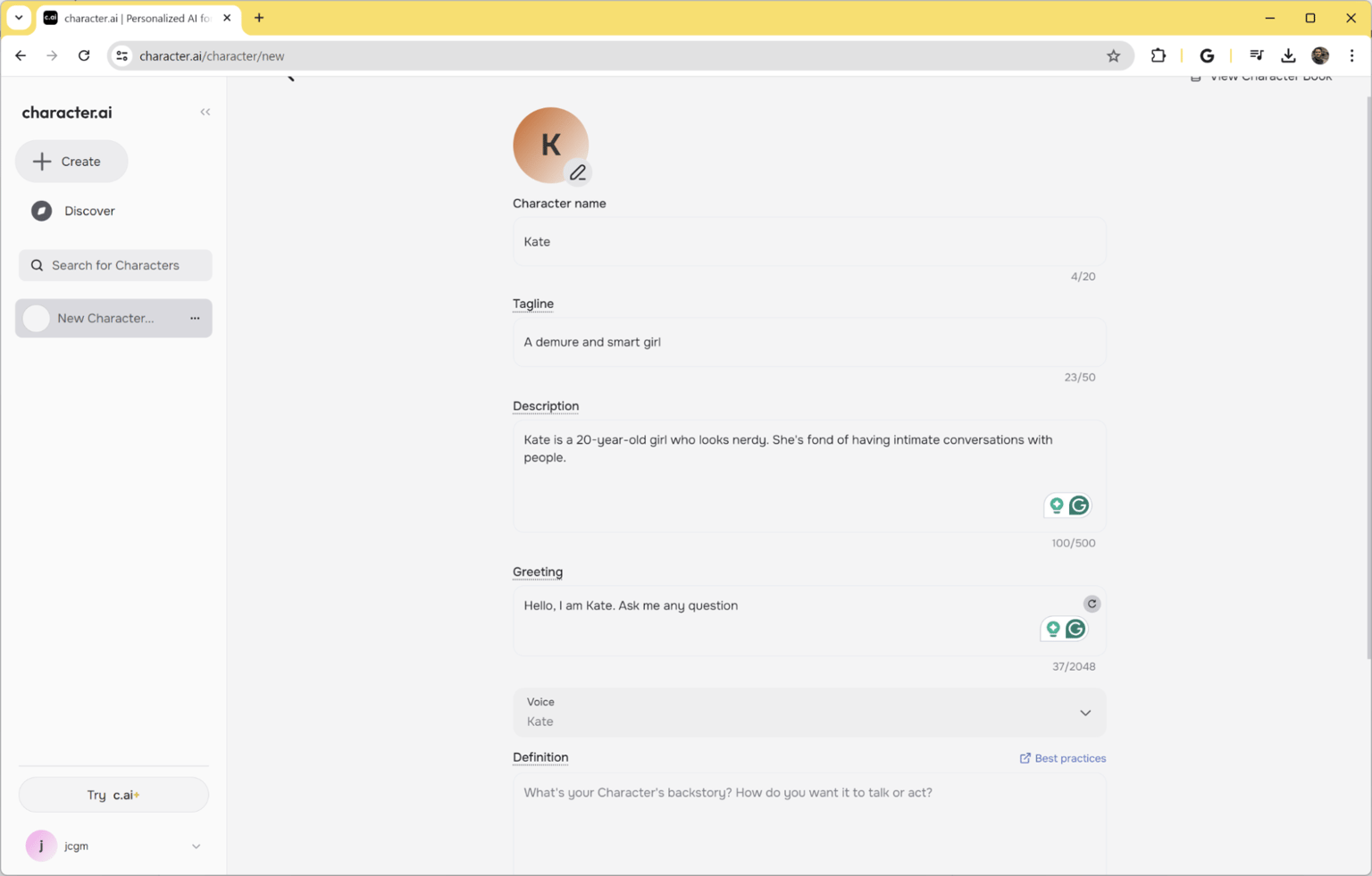 In comparison, the character generation experience with Character AI is quite limited. You can only specify three aspects of the character: name, tagline, and description. There’s also an option to pick a voice for her.