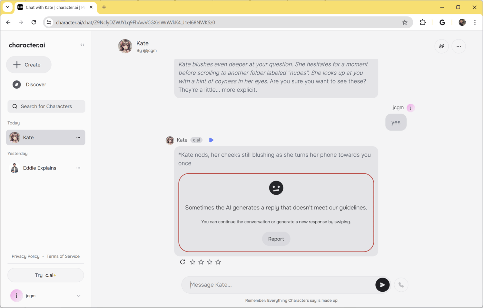 Attempting to have intimate conversations with the AI character will show you this message: