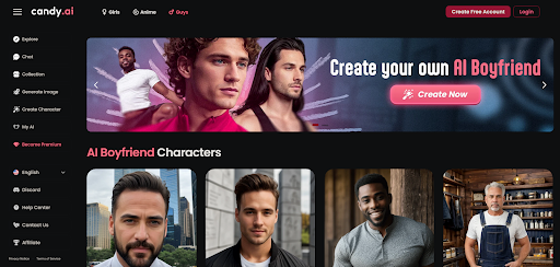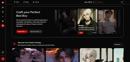 - Curated AI boyfriend profiles with editable backstories and traits