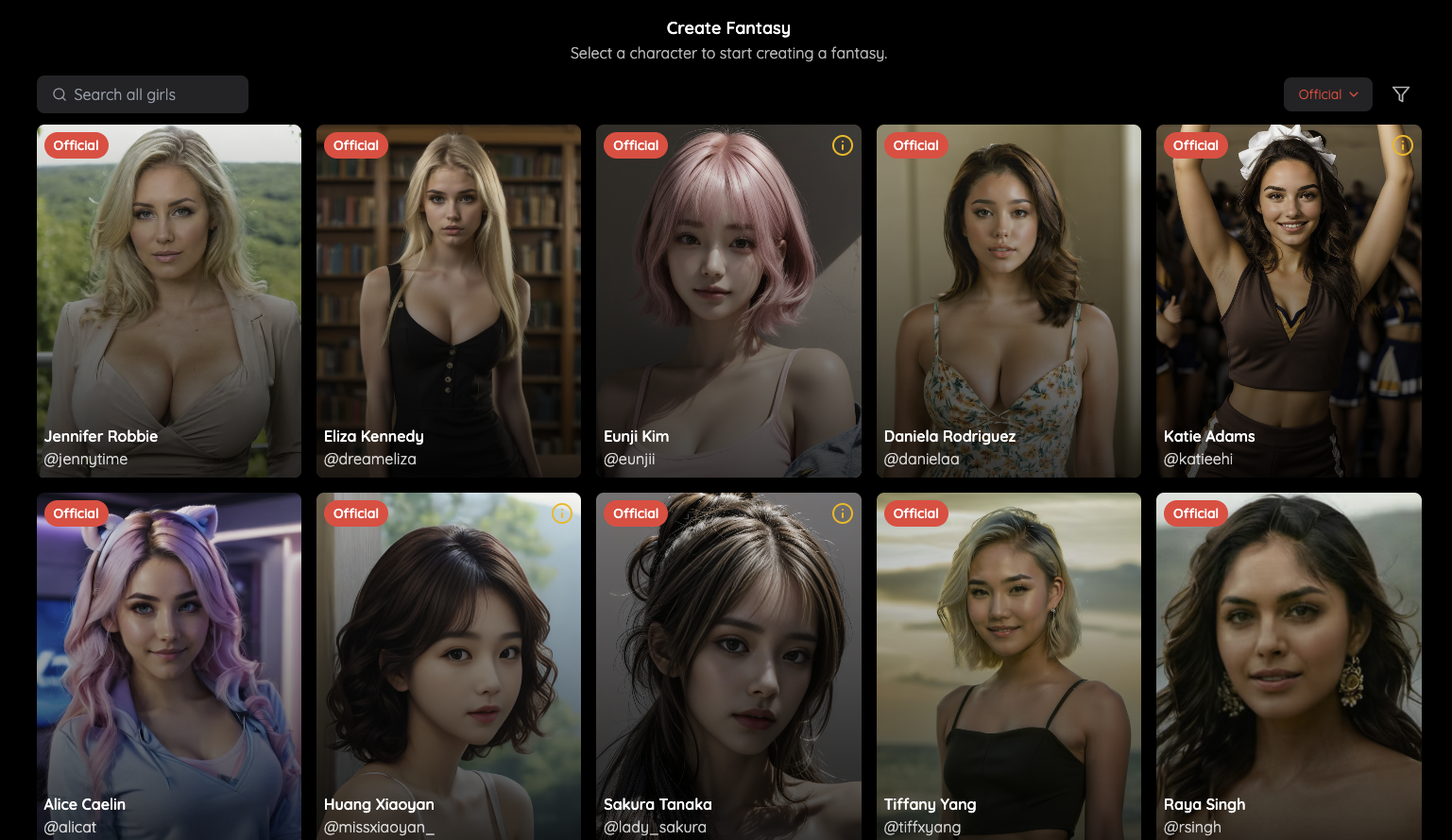 From here you can select from a number of girls to choose from. If you have already created a girl and want to chat but cant find her, click the "My Girls" filter to view your created girls. If you haven't created one but want to do so, head over to "My Girls" and press the red Create button or view this guide "How to Create Your Dream Girl".