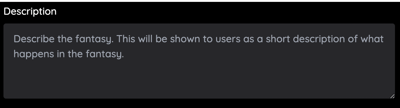 Description: You can describe your fantasy in this section with heavy detail. You can start your description with a single line of ~ 20 words which will show up in the Fantasy preview. After that you can enter the entire setting of your fantasy, detailing the time, place, location of the events. You can