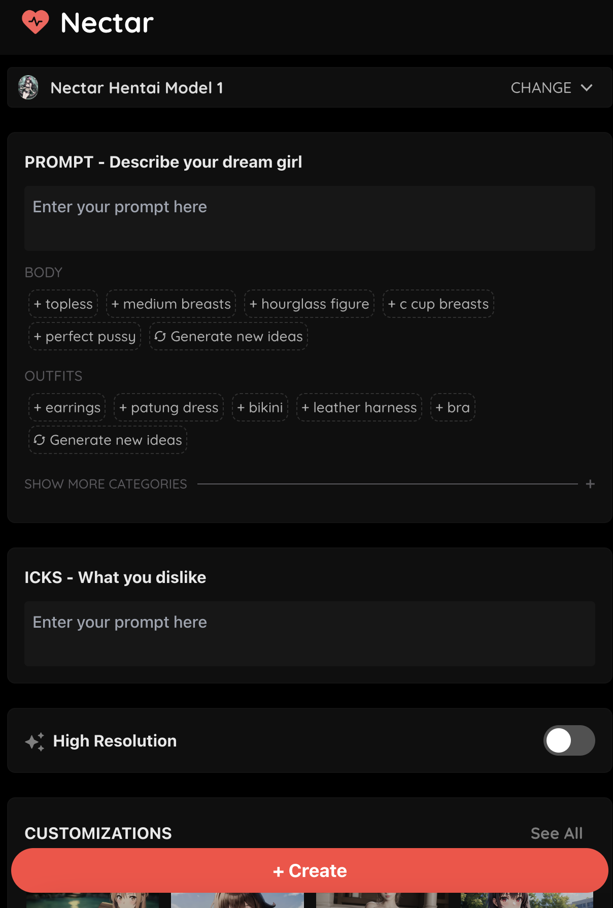 Nectar is an extremely powerful tool that allows you to make the AI Girl of your dreams. While most sites traditionally only allow you to input via tags, Nectar allows for full customizability over whatever you want to create by allowing you to put things into both the prompt and the icks (what you don’t want to see). Try creating your AI companion.