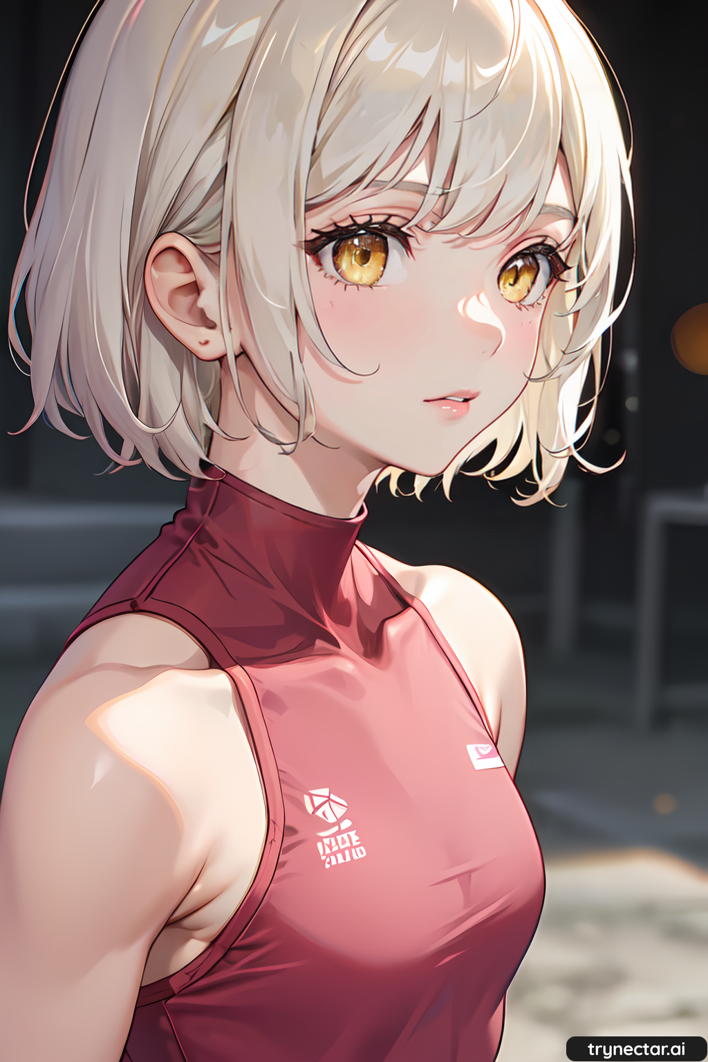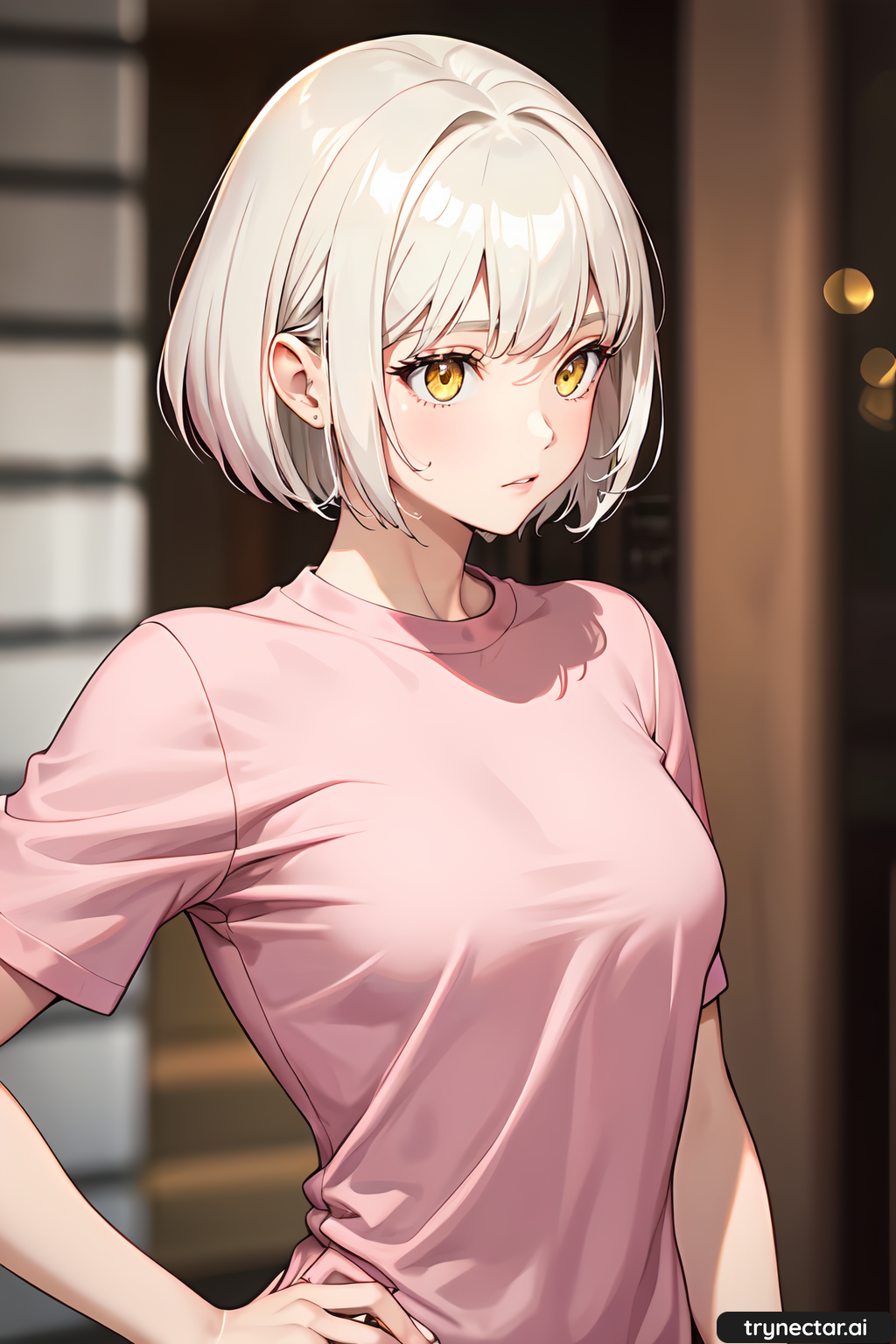 Cute woman with short, platinum blonde hair, golden, striking eyes
