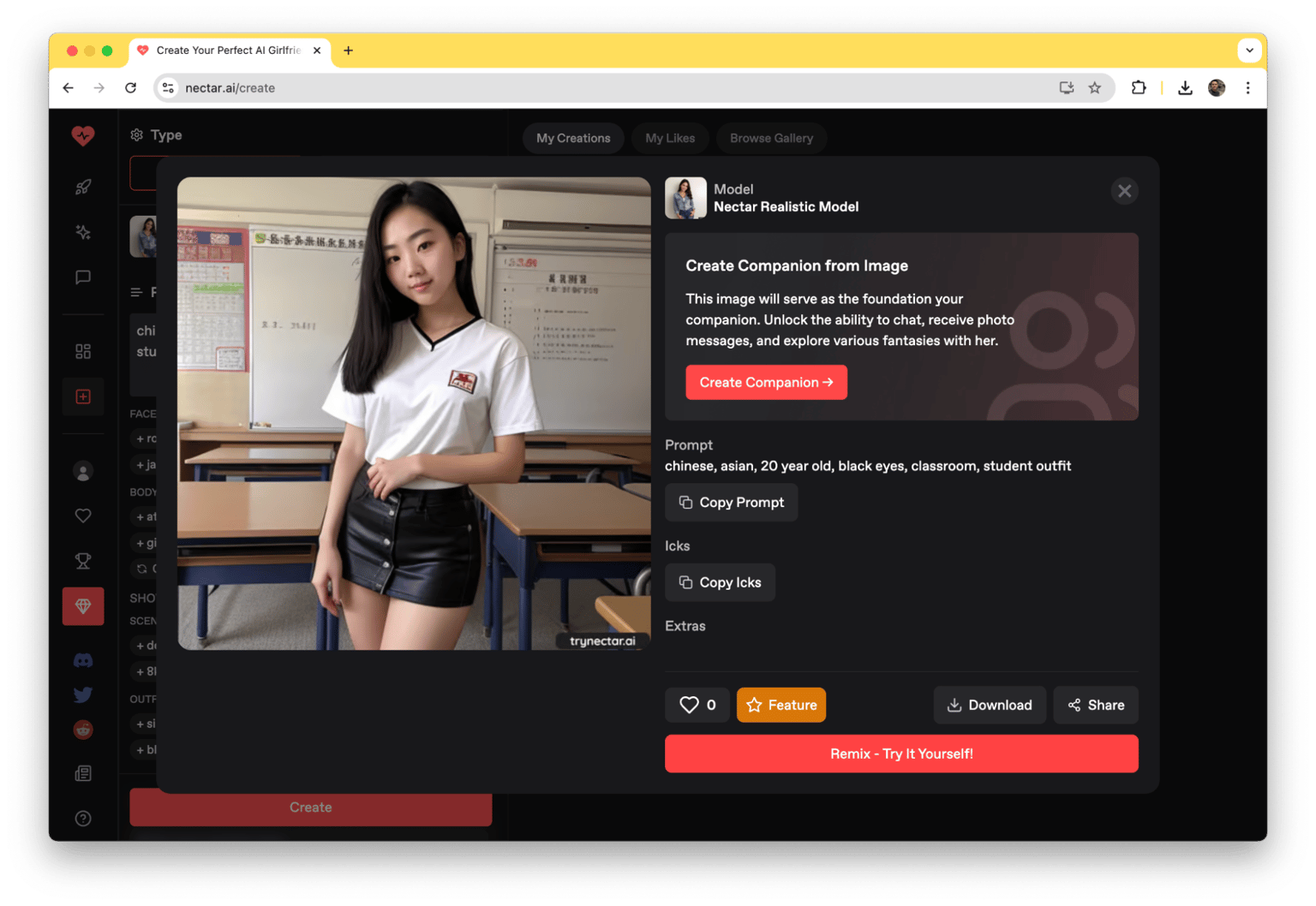 Having this kind of versatility in an AI image generator is powerful. There aren’t many apps or tools on the internet that can do this, and I am glad to see Nectar AI offering such a sophisticated feature. This guide is focused on generating Asian girls, but you can actually create companions from a wide range of ethnicities and backgrounds. The ability to specify and customize the race and personality traits of virtual girlfriends is a unique and significant advantage of Nectar AI. Try creating your AI companion.