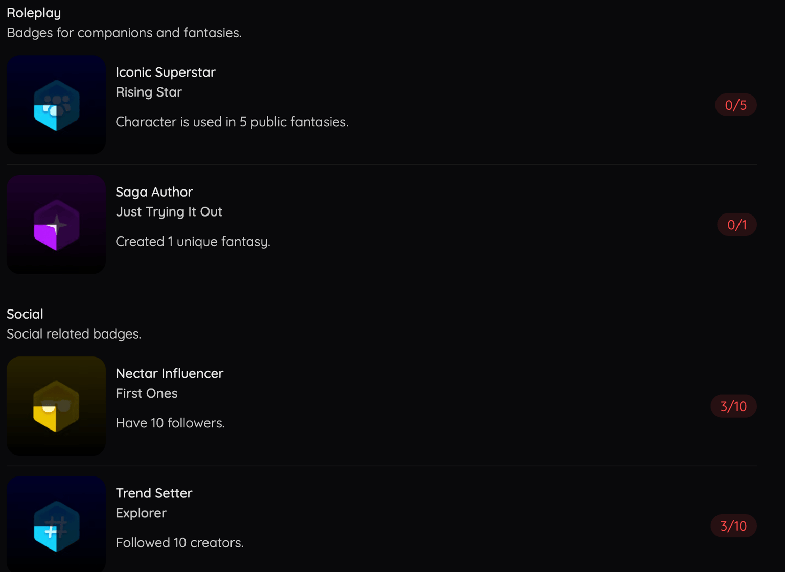 Badges are broken down into several different categories for you to attain such as Image/Video and Roleplay/Fantasy. To earn a badge, you will be required to finish all the necessary achievements. While challenging, they are worthwhile, and you’ll be able to show off the badges you’ve earned on your public profile and let others see your journey.