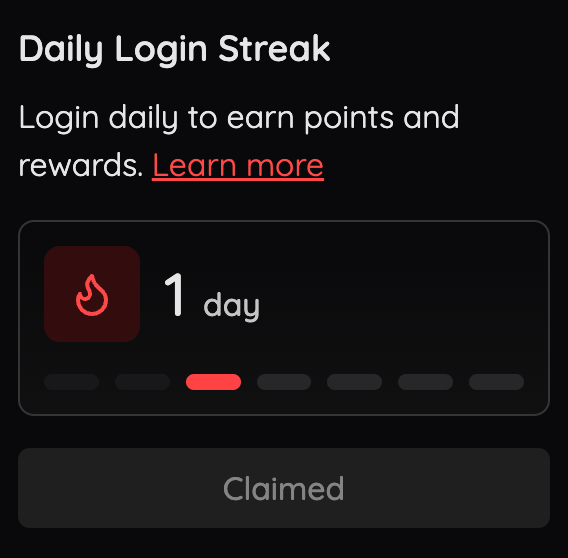 Your login streak is the number of days in a row you have logged in and claimed your daily points. Log in daily to claim your free points and rack up additional bonuses throughout the month. There are rewards for getting for keeping a streak of 7 and 14 days, as well as an end of month reward for signing in every single day of the month. Once you claim your rewards through either our PWA app or web, your streak will increase by 1 day, and is represented by our flame icon that turns red. If you have not met your streak, the flame icon will be greyed out and the claim button will be active. It will become lit once you have met your streak by pressing the button. Keep your streak going and see how high you can go!